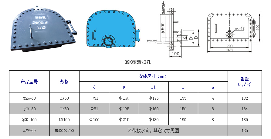 清掃孔裝于重質(zhì)油罐底部,清掃油罐時可放出罐內(nèi)污泥及污水,其中50A、80A、100C帶放水管,出廠時不帶加強板。 它是一個上邊帶圓角的矩形孔,孔的高、寬均不超過1200mm,底邊與罐底平齊。清掃孔多用于大型原油和重油罐。