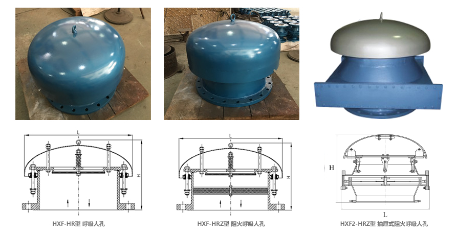 (阻火)呼吸人孔是安裝在儲(chǔ)罐頂上的安全應(yīng)急通氣裝置,通常與呼吸閥配套使用。在(阻火)呼吸閥正常工作情況下,呼吸人孔基本保持密封狀態(tài),儲(chǔ)罐處于正常壓力。當(dāng)呼吸閥正常工作滿足不了因意外原因造成儲(chǔ)罐急劇超壓時(shí),排氣閥盤自動(dòng)頂開,進(jìn)行緊急泄壓,使罐內(nèi)壓力保持正常;當(dāng)罐內(nèi)壓力急劇減壓或超真空時(shí),吸入閥盤便開啟急劇吸入大氣,維護(hù)罐內(nèi)正常壓力;當(dāng)通氣時(shí)遇到帶有火花、火焰時(shí),阻火層起到“器壁效應(yīng)”的作用來阻止火焰的通過,以保護(hù)儲(chǔ)罐的安全。特別適合于儲(chǔ)存物料以氮?dú)饷芊獾墓绊敵汗蓿哂卸▔号欧?、定壓吸入、開閉靈活、安全阻火、結(jié)構(gòu)緊湊、密封性能好、安全可靠等優(yōu)點(diǎn)。