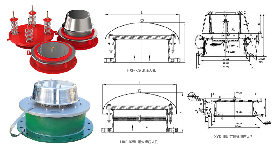 緊急放空人孔是快速泄壓裝置,通常與(阻火)呼吸閥配套使用。在(阻火)呼吸閥正常工作情況下,泄壓人孔基本保持密封狀態(tài),儲罐處于正常壓力。當(dāng)呼吸閥正常工作滿足不了因意外原因造成儲罐急劇超壓時,泄壓人孔的泄壓蓋自動頂開,進(jìn)行緊急泄壓,使罐內(nèi)壓力保持正常。當(dāng)排放氣體遇到帶有火花、火焰時,阻火層起到“器壁效應(yīng)”的作用來阻止火焰的通過,以保護(hù)儲罐的安全。