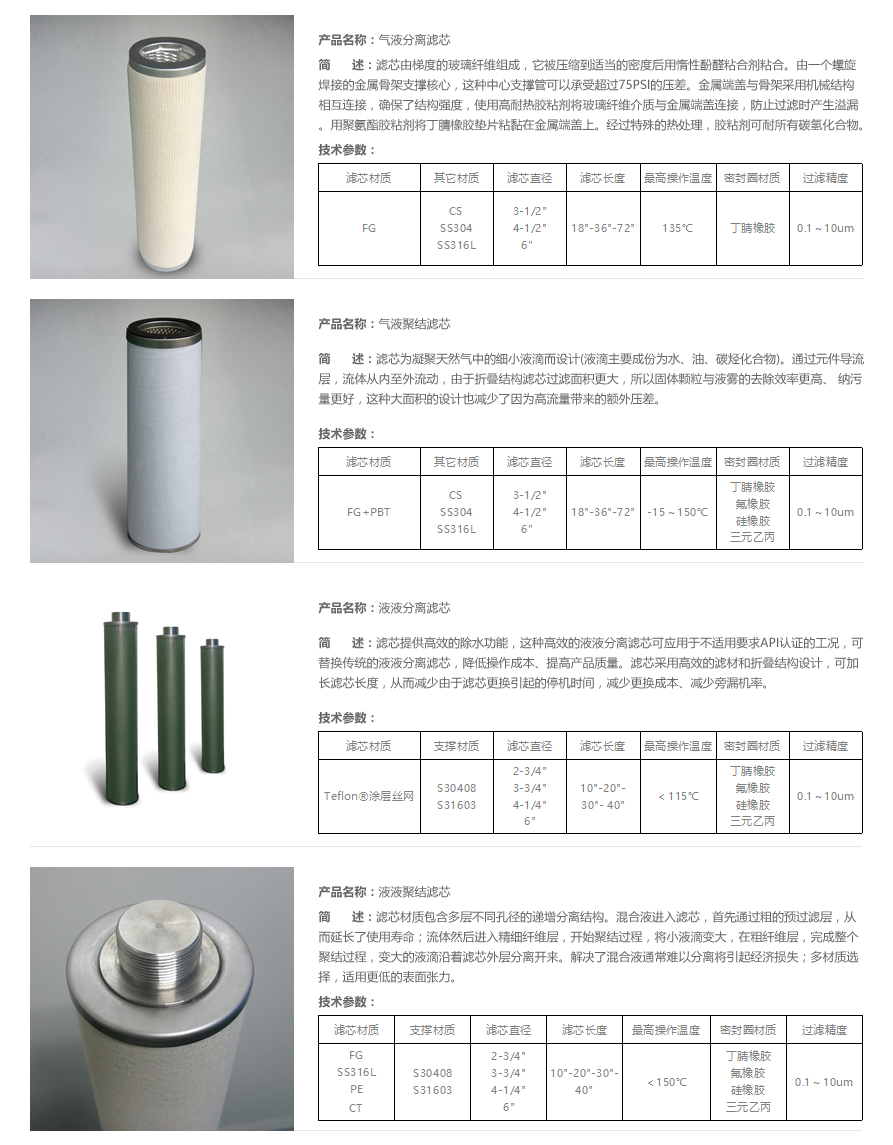 聚結(jié)濾芯是干氣過濾器及聚結(jié)過濾器的核心部件,采用多項核心技術(shù)生產(chǎn)的各種聚結(jié)濾芯,能有效的消除氣體中的顆粒雜質(zhì)及水霧、油污等介質(zhì);或液體中的顆粒雜質(zhì)及油污等介質(zhì)。實現(xiàn)氣液分離、氣液聚結(jié)、液液分離、液液聚結(jié)等理想效果。